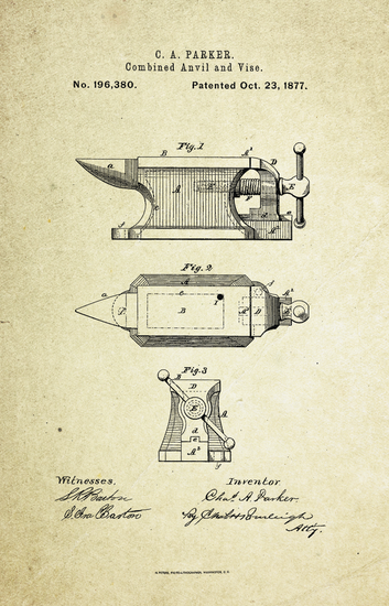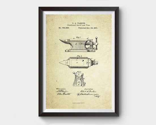 This is a patent poster of an anvil which was registered in 1877 by C.A. Parker. We produce it using high-quality resistant materials, the poster is tear-resistant and waterproof and it comes in 4 different sizes. Framed or Unframed options available.
