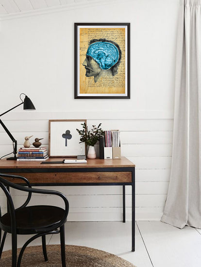This vintage inspired art poster illustrates the head and brain of a man beneath writings of the Black Death. This is a very unique and fun way to add something new and different to your home.